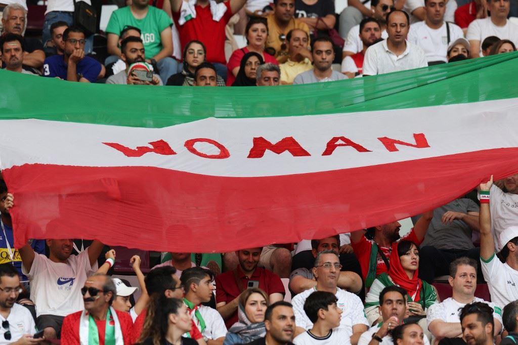 مشجعو منتخب إيران يلوحون بعلمهم الوطني الذي يحمل كلمة "امرأة" خلال مباراة كرة القدم بين إنكلترا وإيران في استاد خليفة الدولي، الدوحة (21 ت2 2022 - أ ف ب).