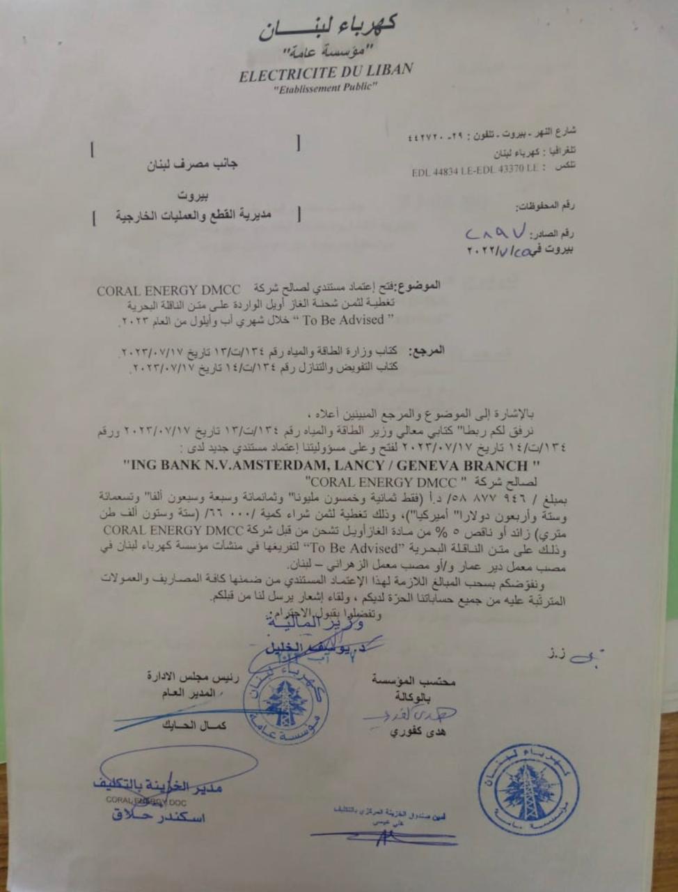 أكدت وزارة الطاقة والمياه أنّ "لا استدامة في تنفيذ خطة الكهرباء وزيادة التغذية دون استيراد الفيول إضافة إلى الفيول العراقي، وأموال الباخرة مرصودة من ضمن مبلغ الـ300 مليون دولار بقرار من الحكومة والصادر في الجريدة الرسمية في كانون الثاني المنصرم لم يُحجَز منها إلّا 193 مليون دولار الى الآن ويبقى 107 مليون دولار، وخطاب الاعتماد الأخير بباخرة الفيول بقيمة 58 مليون دولار (وليس 80 مليوناً!) ومصادق عليه من وزير المال ويطلب فيه من المصرف المركزي تنفيذه".