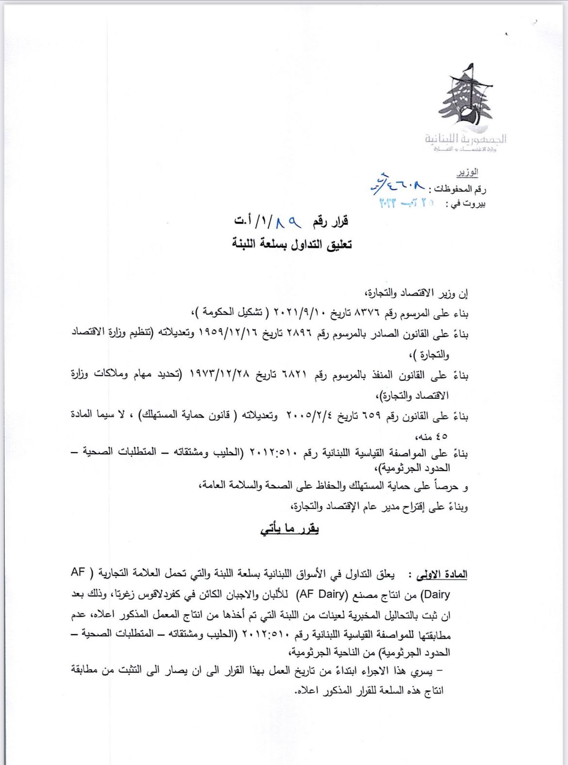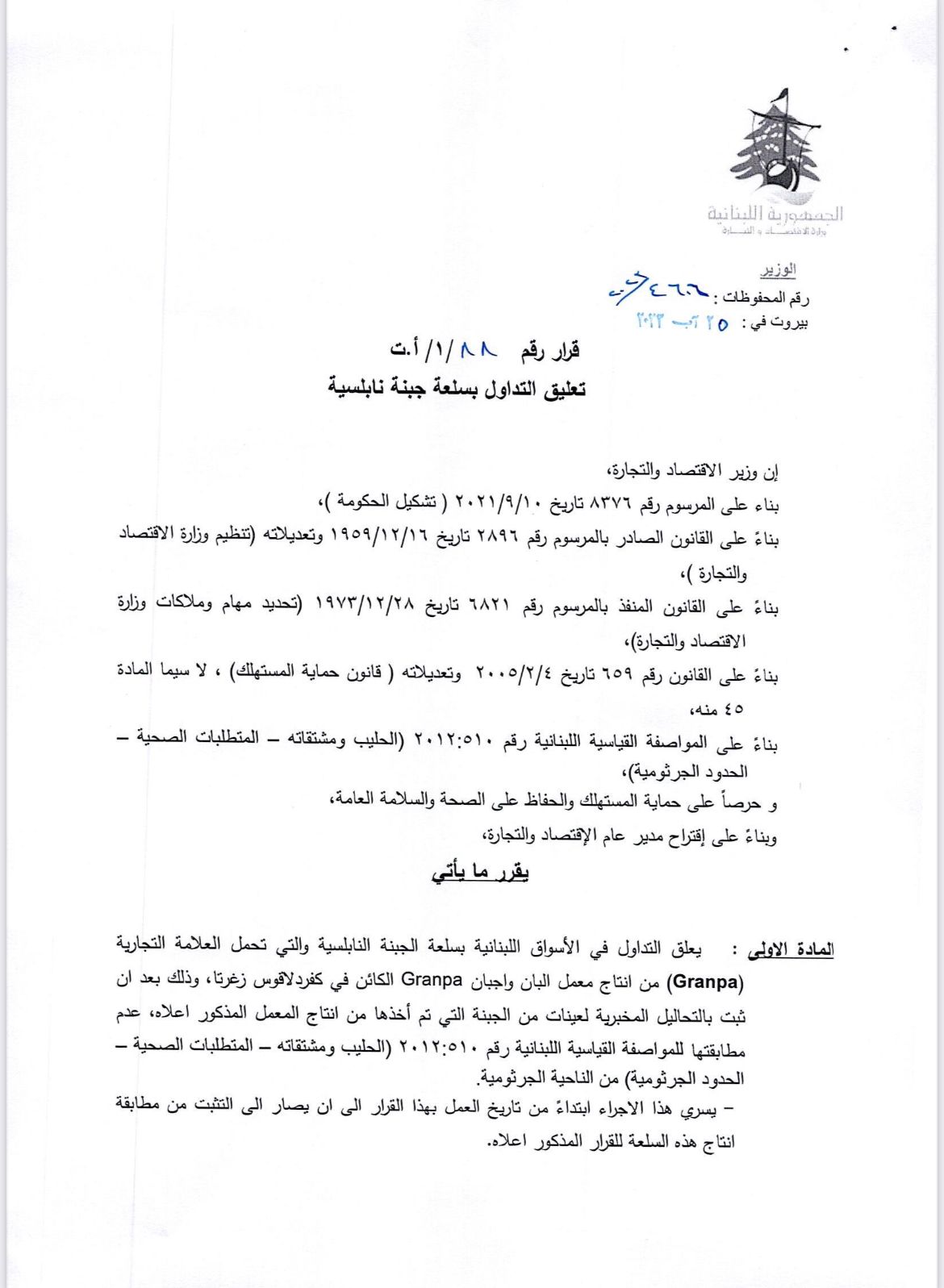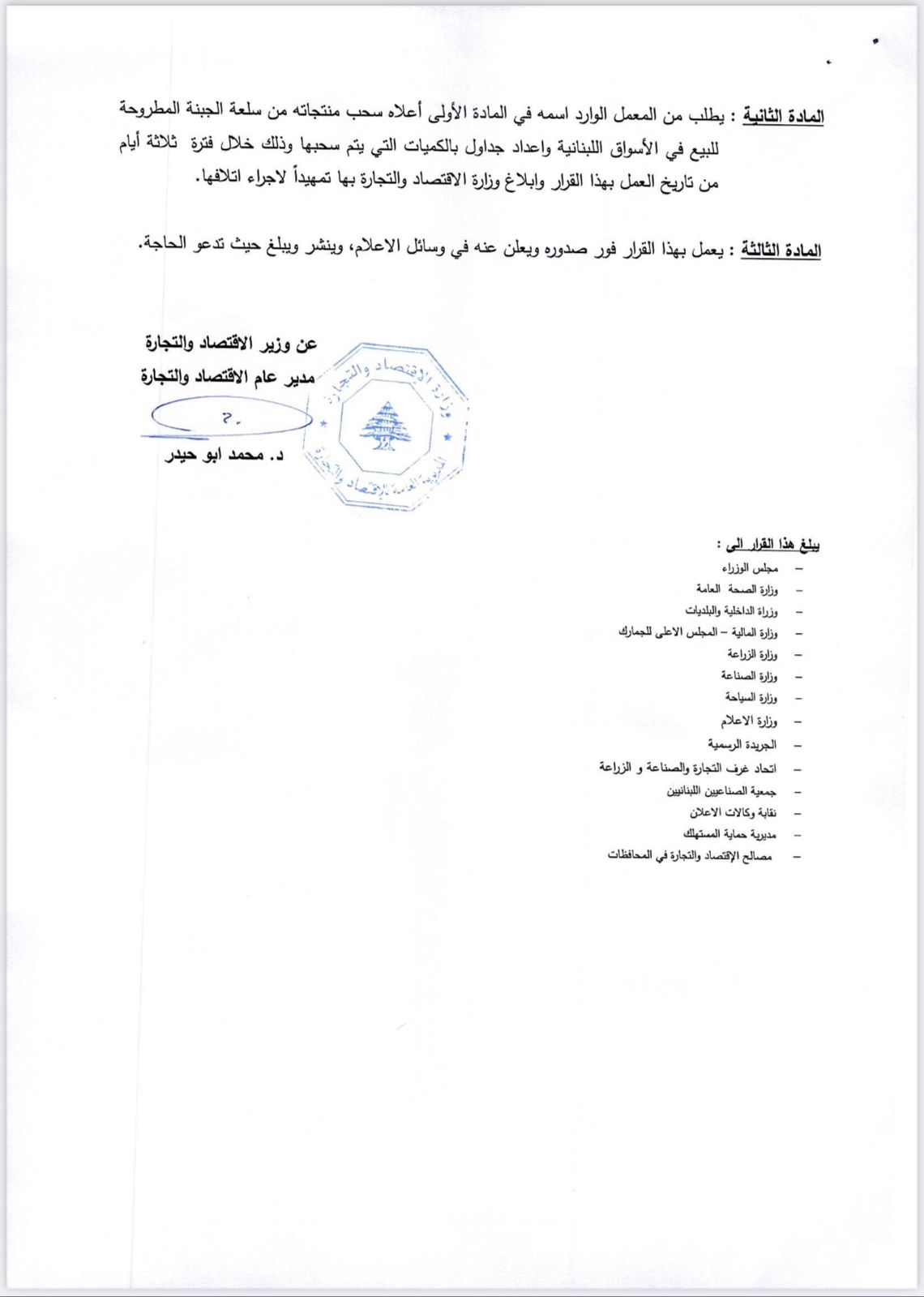 علّق المدير العام لوزارة الاقتصاد والتجارة محمد أبو حيدر التداول بصنفَين من اللبنة والجبنة وطلب سحبهما من الأسواق، لعدم مطابقتهما للشروط الصحية ومن الناحية الجرثومية.