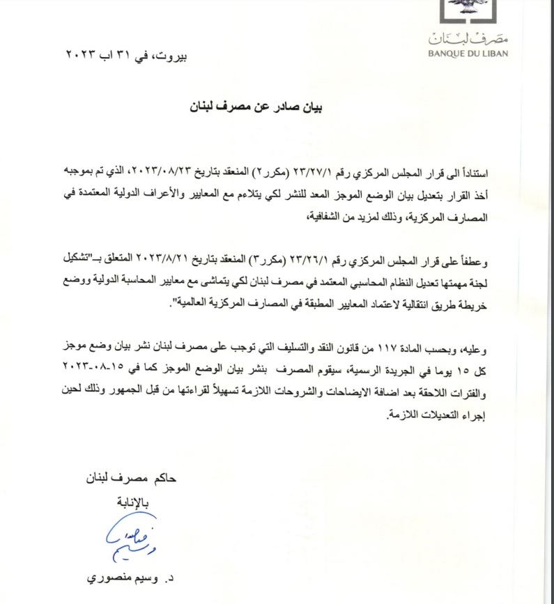 أعلن حاكم مصرف لبنان بالإنابة وسيم منصوري أنّ "المصرف سيقوم بنشر بيان الوضع الموجز كما في 15-8-2023 والفترات اللاحقة، بعد إضافة الإيضاحات الشروحات اللازمة، تسهيلاً لقراءتها من قبل الجمهور".