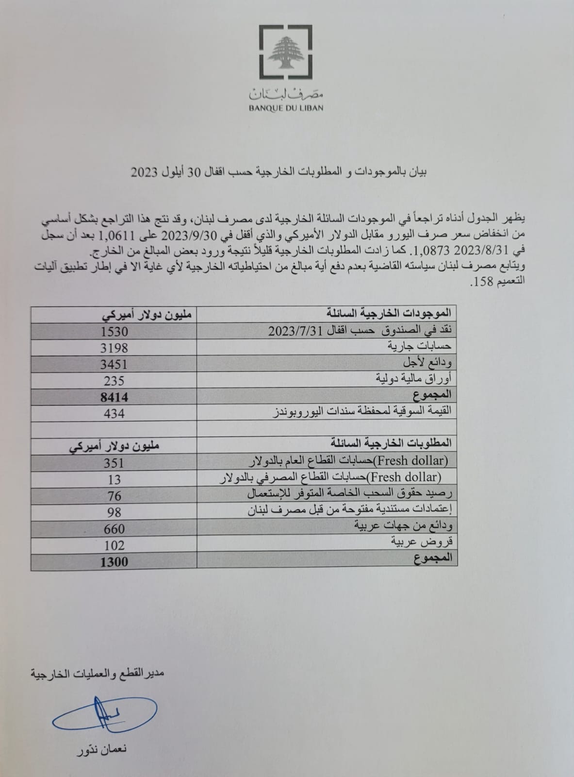 بيان لمصرف لبنان يظهر الموجودات والمطلوبات الخارجيّة حسب إقفال 30 أيلول 2023