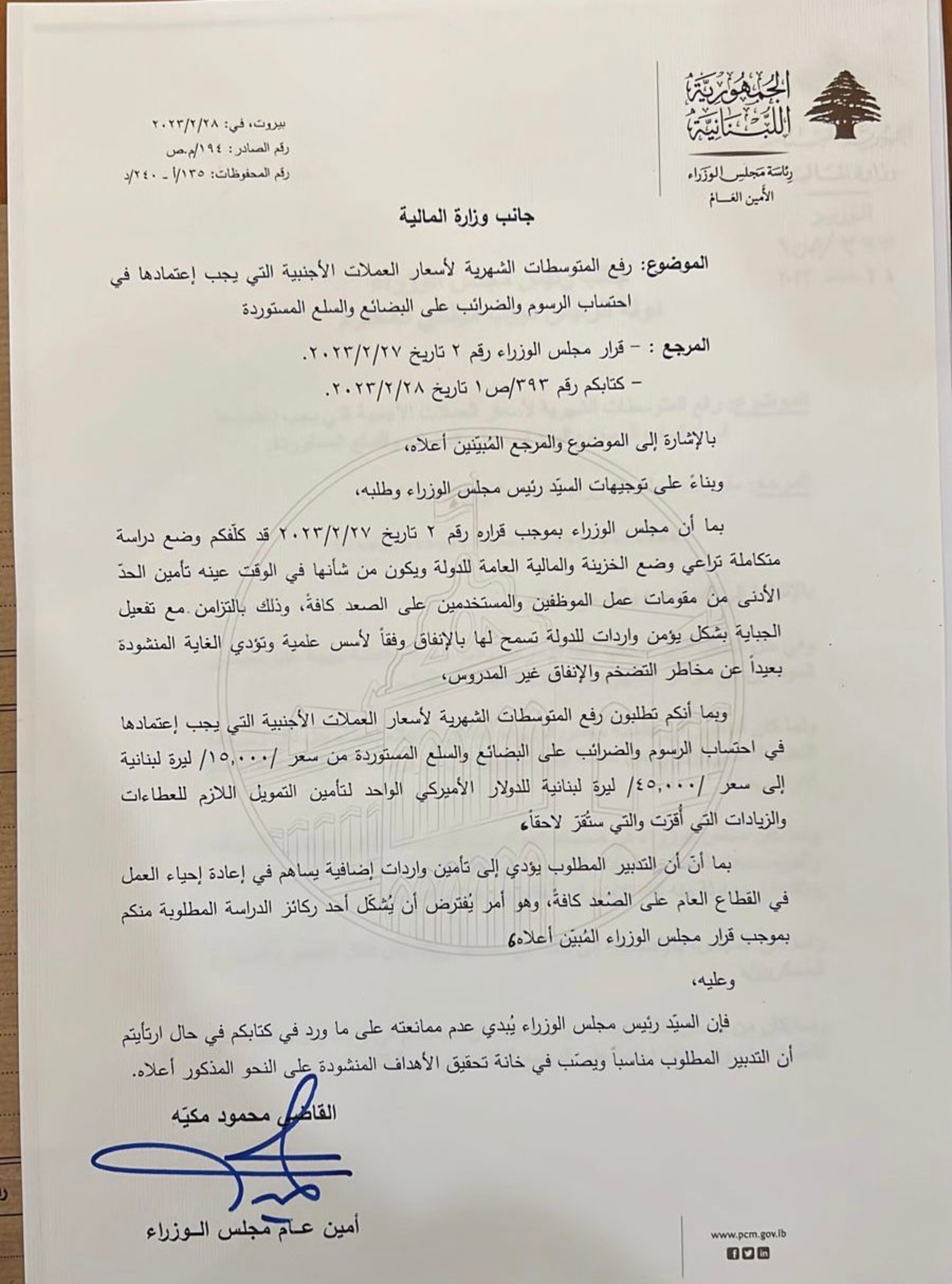 ويأتي هذا الإجراء بناء على طلب وزير المال يوسف خليل من الحكومة الموافقة على رفع المتوسطات الشهرية لأسعار العملات الأجنبية التي يجب اعتمادها في احتساب الرسوم والضرائب على البضائع والسلع المستوردة من سعر 15 ألف ليرة لبنانية إلى سعر 45 الف ليرة لبنانية للدولار الأميركي الواحد لتأمين التمويل اللازم للعطاءات والزيادات التي أقرت والتي ستقر لاحقاً.