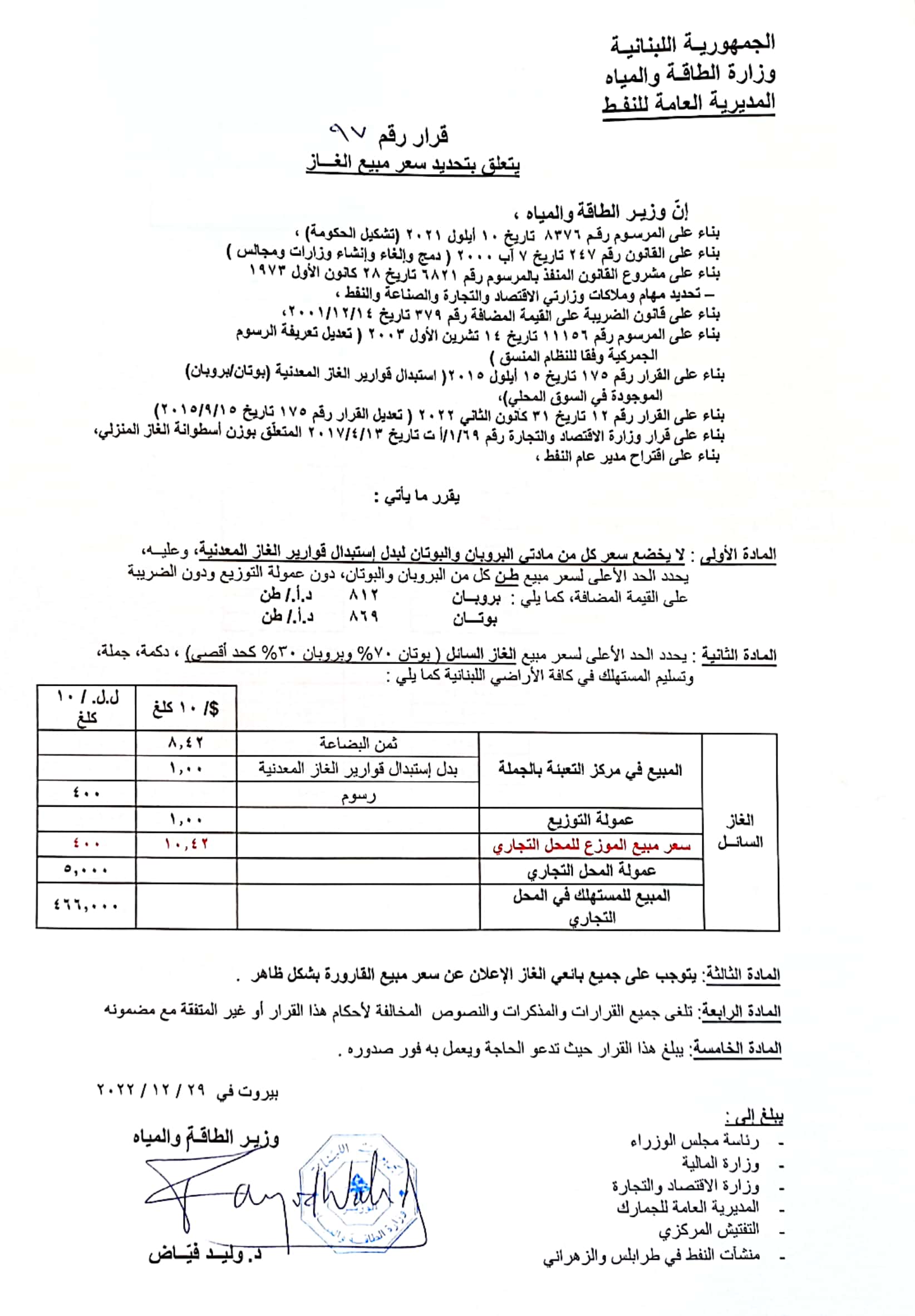 أصدرت وزارة الطاقة أسعار المحروقات لليوم الخميس حيث ارتفعت الأسعار جميعها وجاءت على الشكل التالي:
