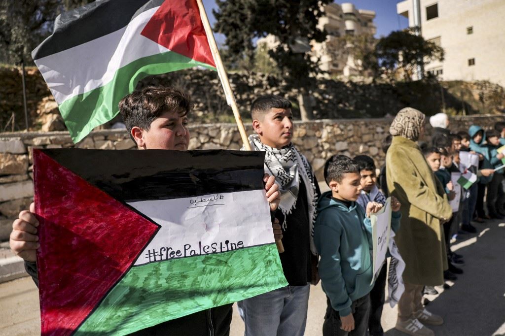 طلاب مدرسة في فلسطين يرفعون العلم الفلسطيني نصرة لغزّة (أ ف ب).
