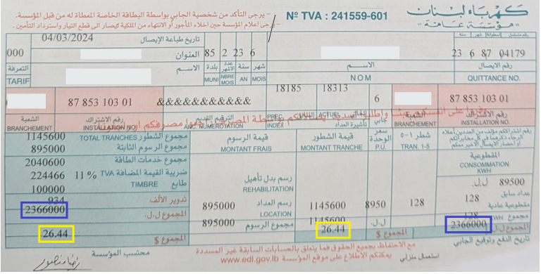 أصدرت شركة بوتك للصيانة والتشغيل BUS بياناً توجهت فيه إلى جميع المشتركين في المنطقة الجغرافية الأولى (جبل لبنان الشمالي - محافظة لبنان الشمالي - محافظة عكار). وقالت: "إنه بناءً على بيان مؤسسة كهرباء لبنان الصادر بتاريخ 6 شباط 2024، نحيطكم علماً أنّه ابتداءً من إصدار شهر أيار2023، ستحتسب قيمة فاتورة الكهرباء بالليرة اللبنانية وما يعادلها بالدولار الأميركي وبالتالي بات بإمكان المشتركين تسديد قيمة الفاتورة بإحدى العملتين حسب الرغبة، وعليه لا يمكن الدفع بالعملتين معاً أي دفع جزء من المبلغ بالدولار الأميركي وجزء بالليرة اللبنانية. وفي حال رغب المشتركون في الدفع بالدولار الأميركي، نرجو تأمين المبلغ كاملاً أو بالحد الأقرب إلى قيمة الفاتورة وذلك بهدف تسهيل عملية الجباية.