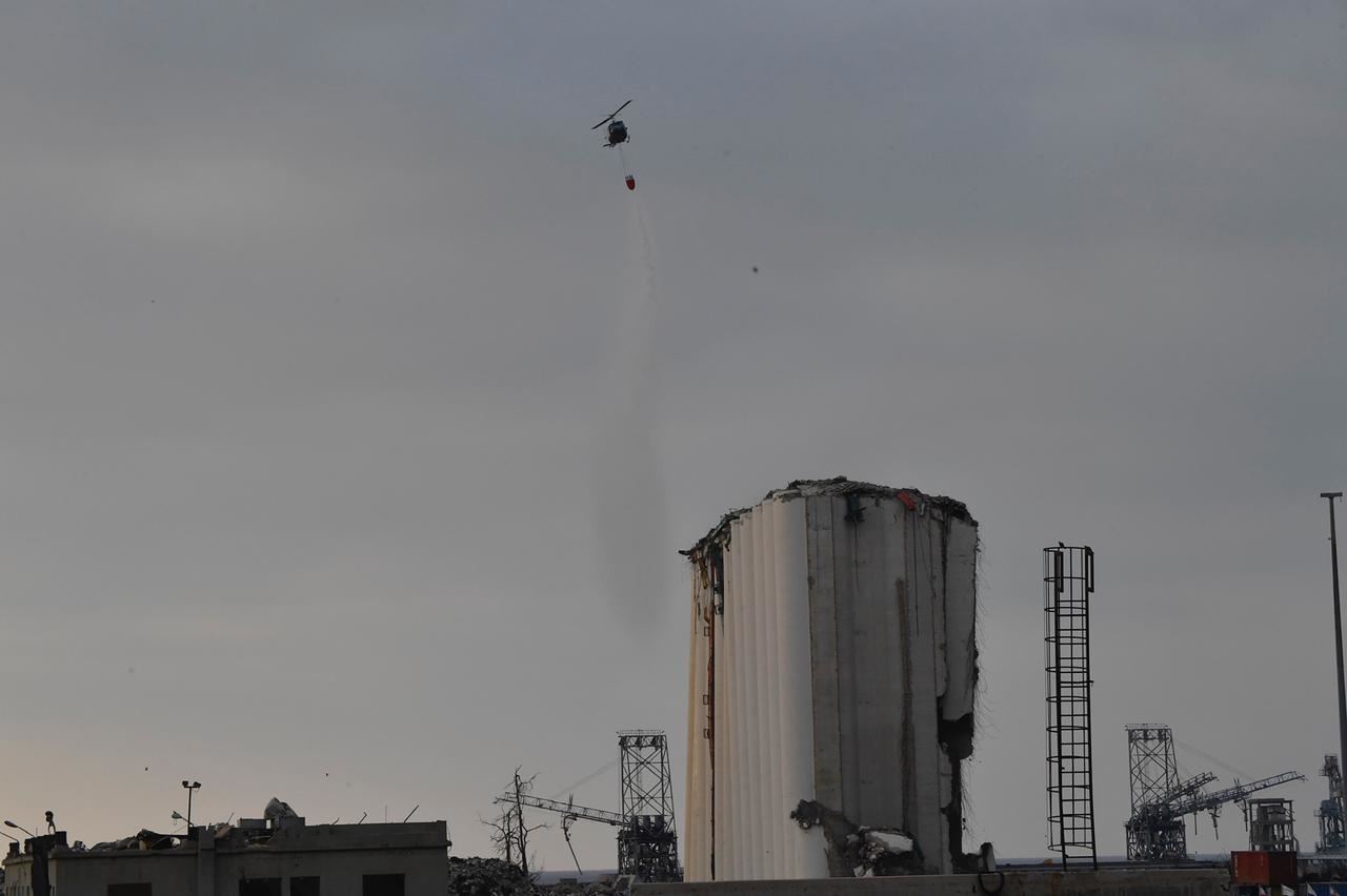 طوافة الجيش ترشّ الصوامع بالمياه بعد انهيارها (حسام شبارو).