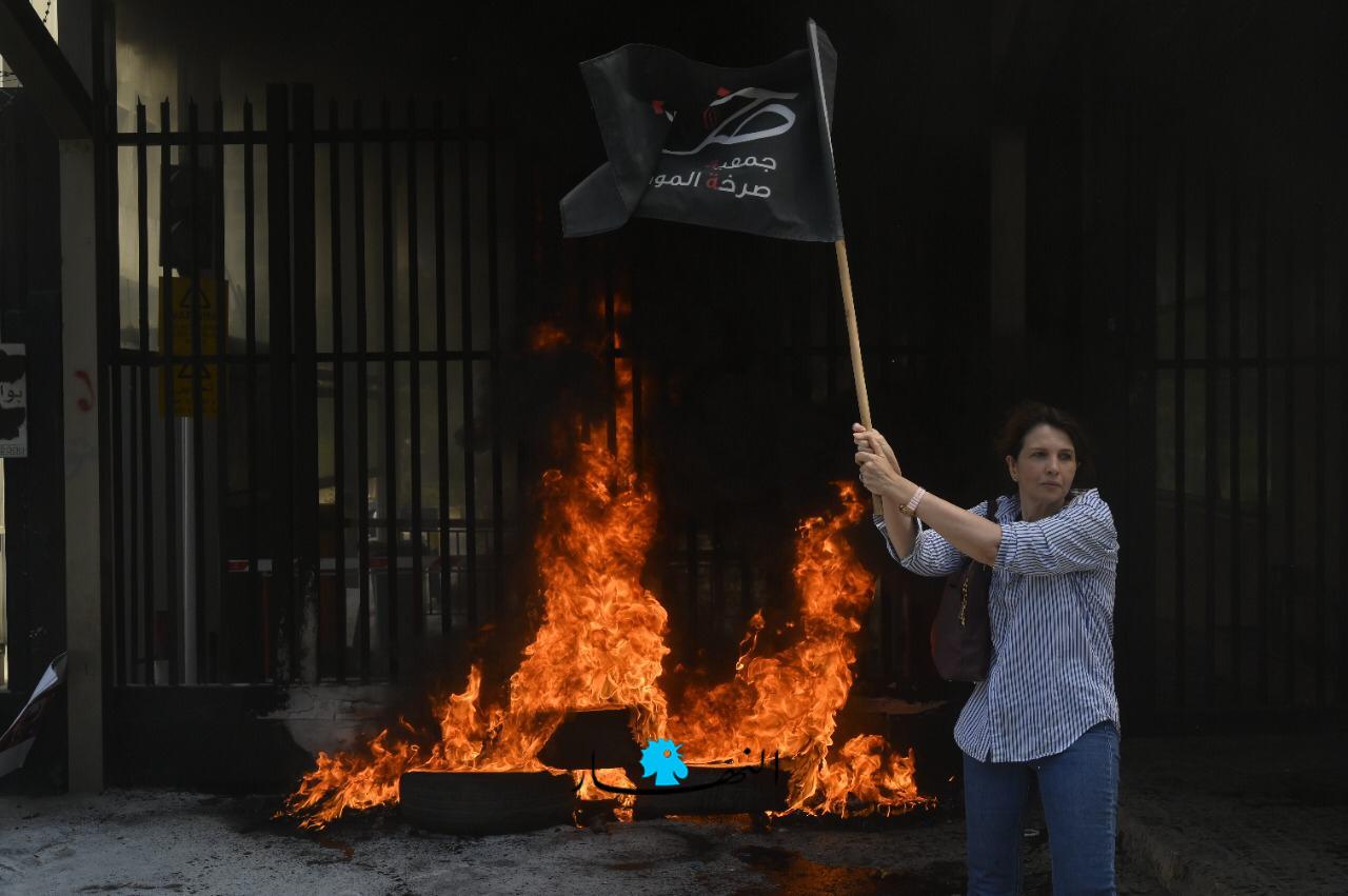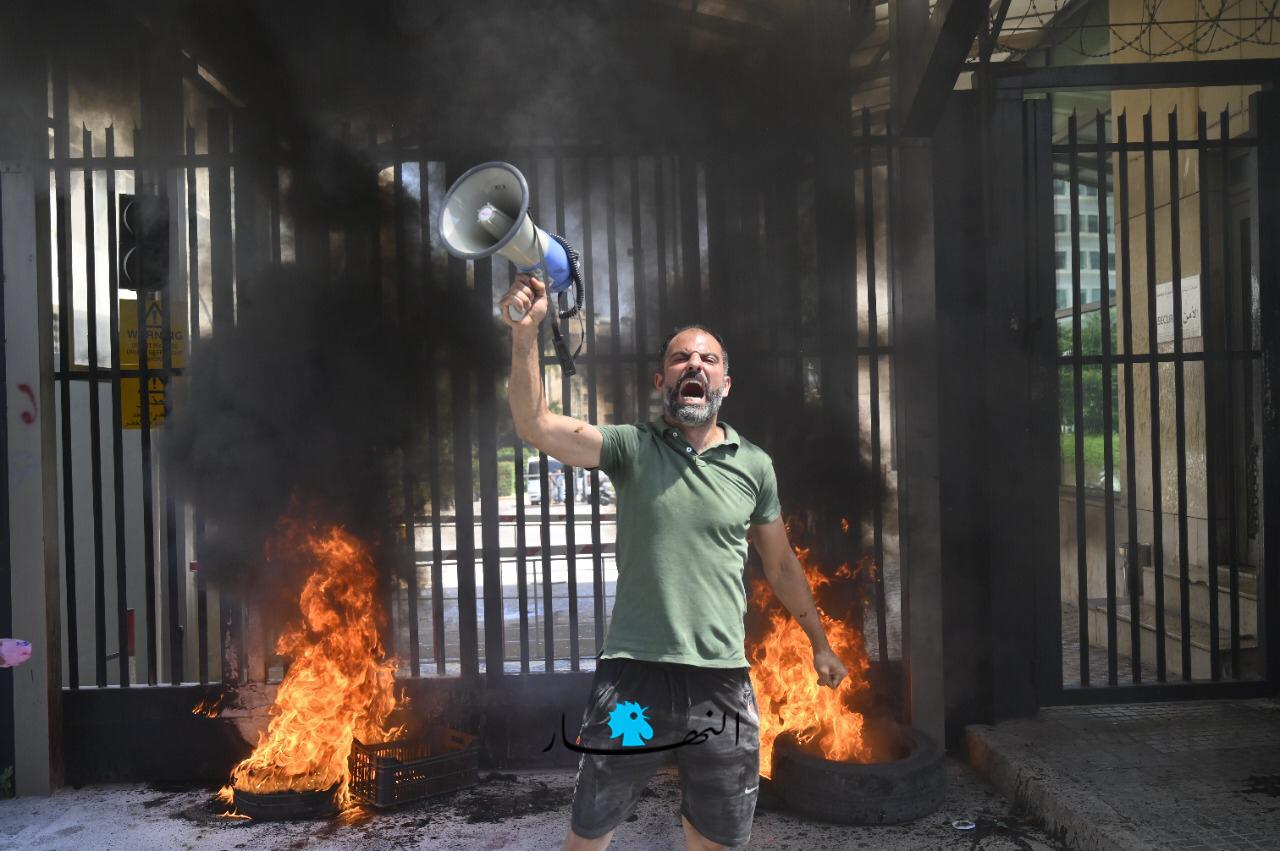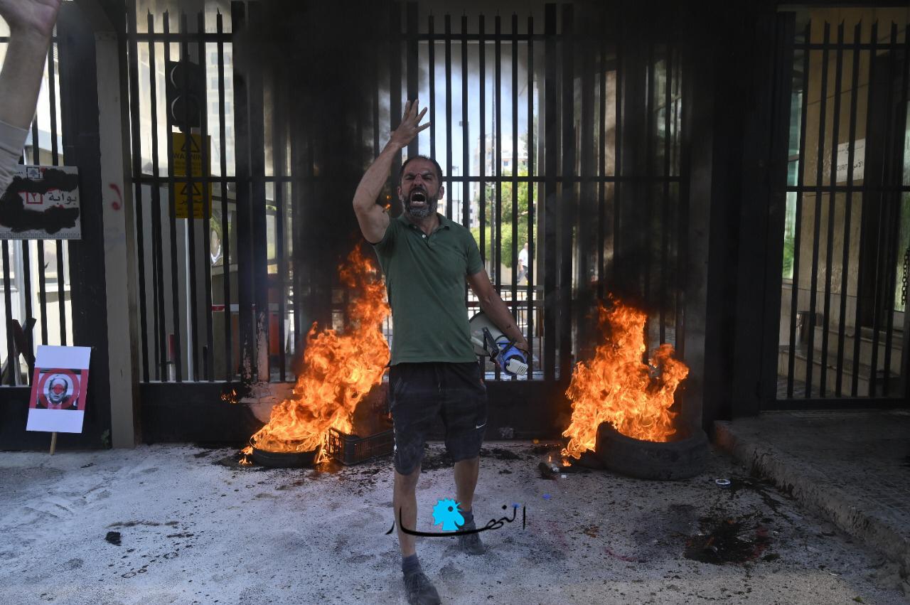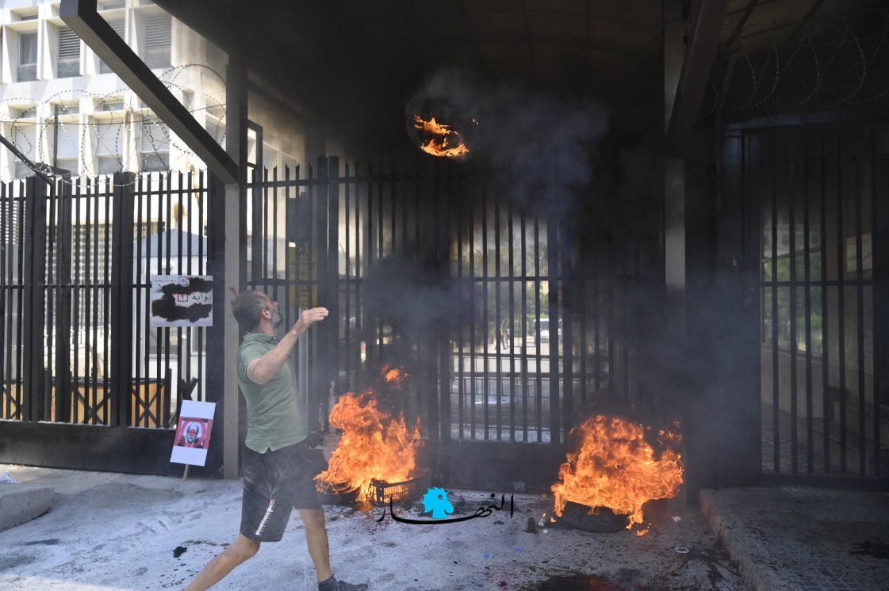 وعمد المحتجّون إلى إحراق الإطارات وقطع الطريق وسط انتشار كثيف لعناصر القوى الأمنية.ورفع المشاركون لافتات عدّة كُتب عليها "نحن حزب المودعين" و "حرامية الودائع".