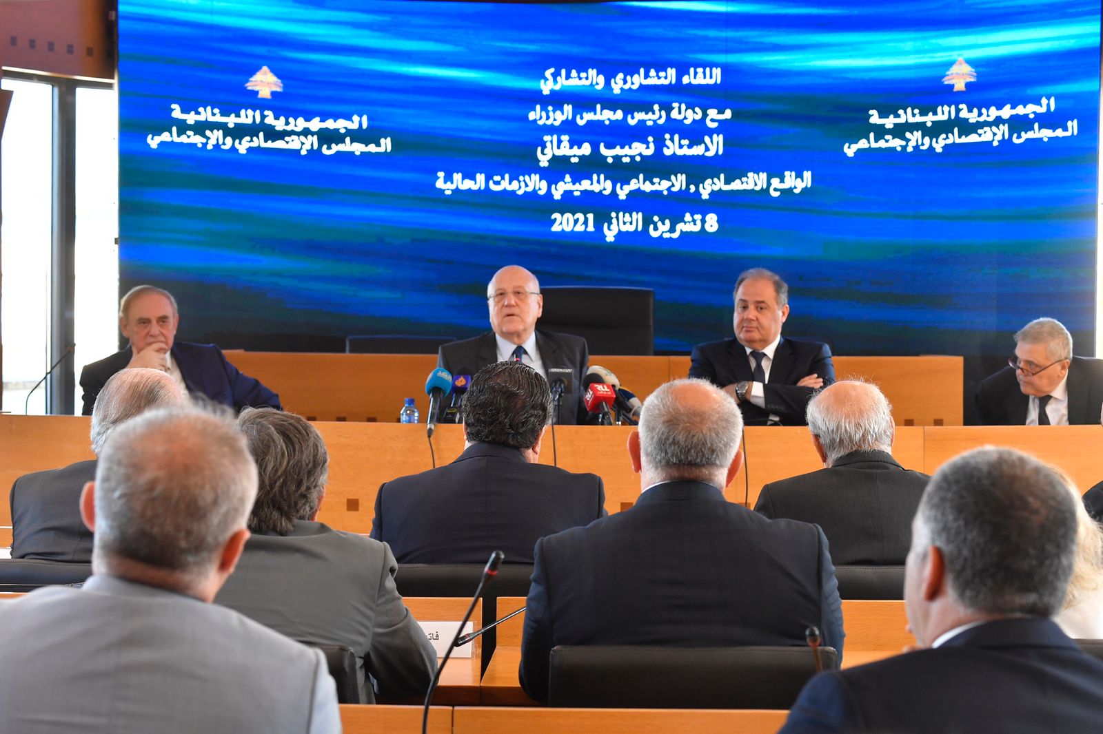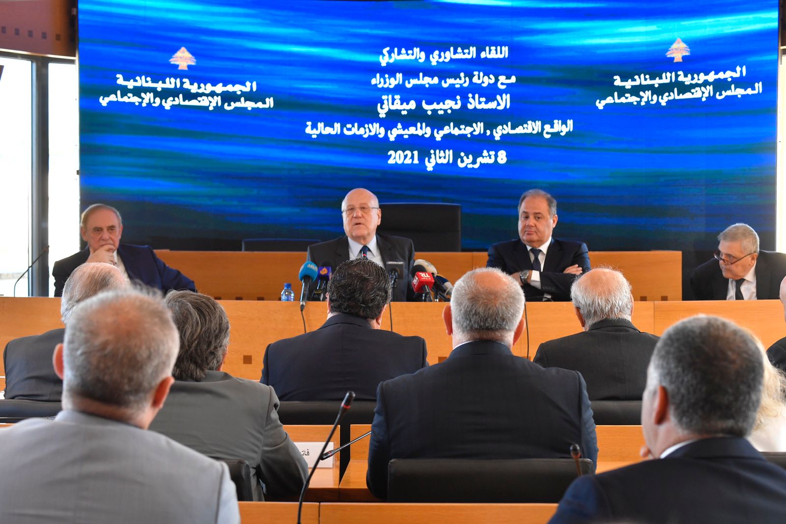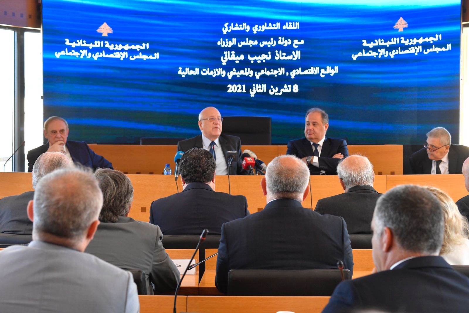 من جهته، قال رئيس المجلس الاقتصادي والاجتماعي شارل عربيد: "نعود لنلتقي مجدداً في المجلس الاقتصادي والاجتماعي، في لحظةٍ شديدة الخطورة من عمر بلدنا، لا تحتاج توصيفات أو شروحات"، متوجهاً إلى ميقاتي بالقول "نحن هنا في هذه المؤسسة التي عرفت اهتمامكم واعتادت مشاركتكم ودعمكم لجهودها، اعتدنا قول الكلمة المسؤولة، مهما كانت مرّة، ولو كانت آخر ما يود الناس سماعه، نظراً لثقل الحقيقة في أحوال كأحوالنا. نحن اخترنا أن نقول الكلمة المسؤولة، ليس من باب تحميل الأعباء بل من باب مشاركتها".