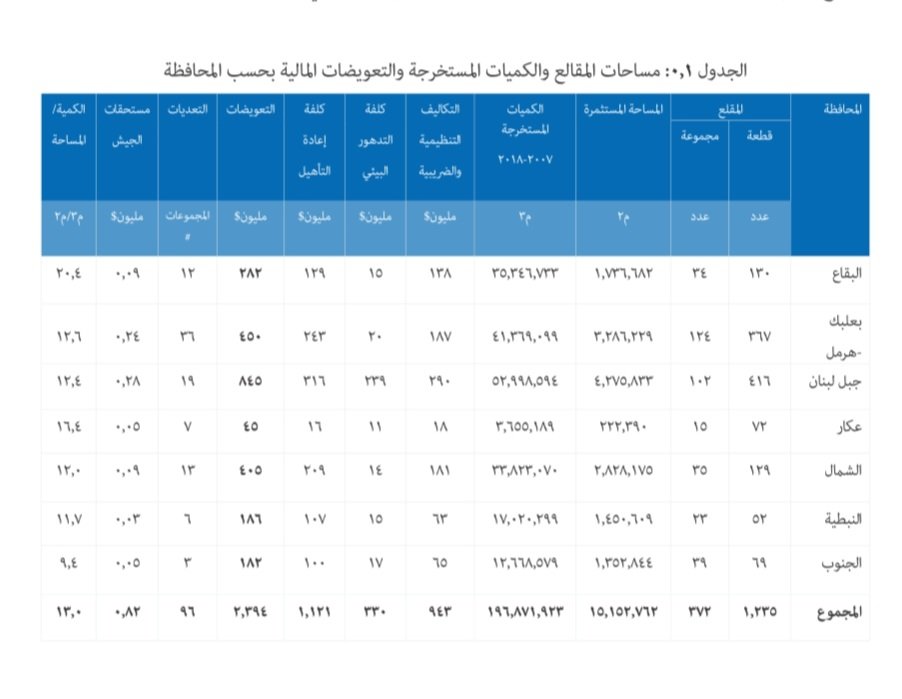 وعُرضت في المؤتمر دراسة حول عدد المقالع والكسارات وتوزيعها على المناطق اللبنانية، وخصوصا في البقاع وجبل لبنان وعكار والنبطية وجنوب لبنان وعددها 1235 مقلعا وكسارة. وأظهرت الدراسة أن مجموع المساحة المستثمرة منذ 2007 هو نحو 15,15 مليون متر مربع، فيما حجم المواد المستخرجة هو نحو 196,87 مليون متر مكعب. أما المستحقات المباشرة للخزينة، وهي عبارة عن التعويض المالي المباشر، فقدرت بالحد الادنى بنحو 2,394 مليار دولار أميركي.