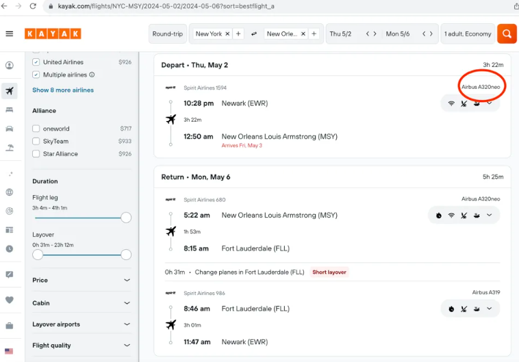ويظهر أيضاً نوع الطائرة على خدمات تجميع رحلات الطيران، مثل Google Flights أو Kayak، إذ يعرض Kayak نوع الطائرة عند النقر على رحلة الطيران، بينما يعرضها Google عند النقر على السّهم إلى الأسفل للكشف عن المزيد من التفاصيل. وفي كلتا الحالتين، من السهل جداً العثور على هذه المعلومة.