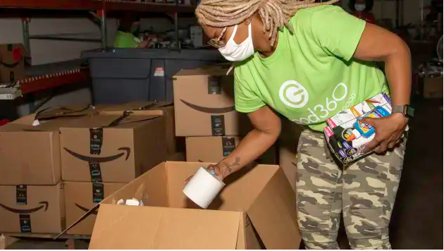 تحقيقاً لهدفها، أطلقت "أمازون" في العام 2019 برنامج تبرعات يسمح للبائعين الأميركيين بالتبرع تلقائياً بالسلع الزائدة والمُعادة لشبكة تضم 100000 جمعية خيرية محلية، من خلال شراكة مع شبكة غير ربحية Good360. وتعمل المنظمة مع نحو 400 شركة، بما في ذلك شركات عملاقة مثل Walmart و CVS و Nike ، لكنّها تؤكّد أنّ "أمازون" هي أكبر شركة مانحة لها.