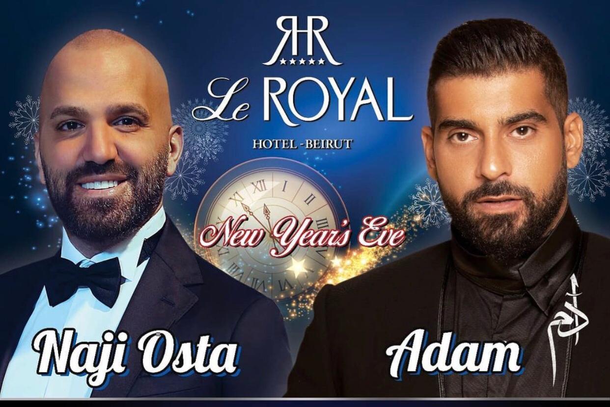 ستُقام في فندق Le royal أربع حفلات لسهرة رأس السنة؛ سهرتان يُحييهما فنّانون في الصالات الكبيرة، وسهرتان في المطاعم. أمّا القسم الأول، فيحيي سهرة منها الفنانان ناجي الأسطا وآدم، والسهرة الثانية يحييها هشام الحاج ورضا وكريستينا صوايا.