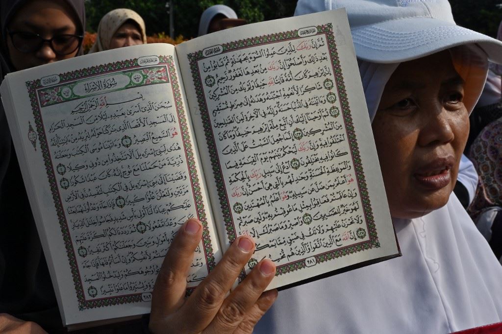 سيدة إندونيسية ترفع نسخة من القرآن الكريم (أ ف ب).