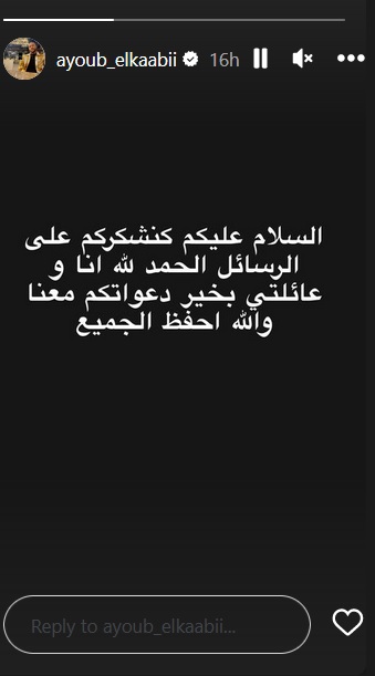 وكتب الكعبي عبر حالة "ستوري" في "إنستغرام": "السلام عليكم، أشكركم على الرسائل، الحمد لله أنا وعائلتي بخير، دعواتكم معنا، واللهم احفظ الجميع".