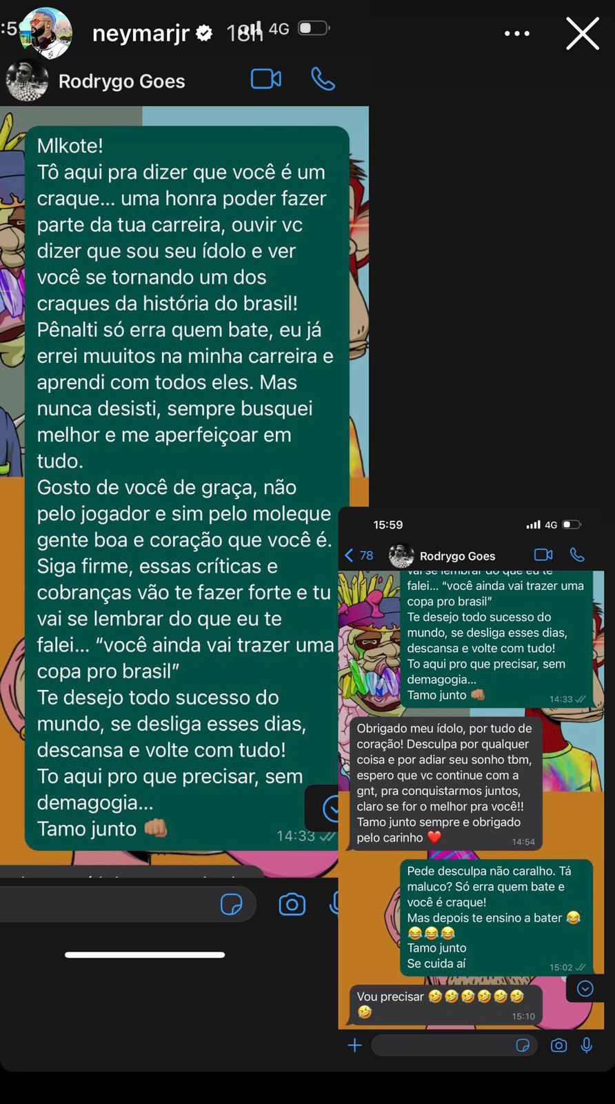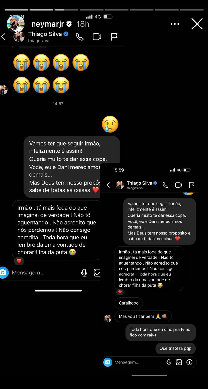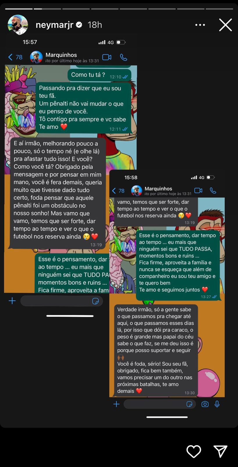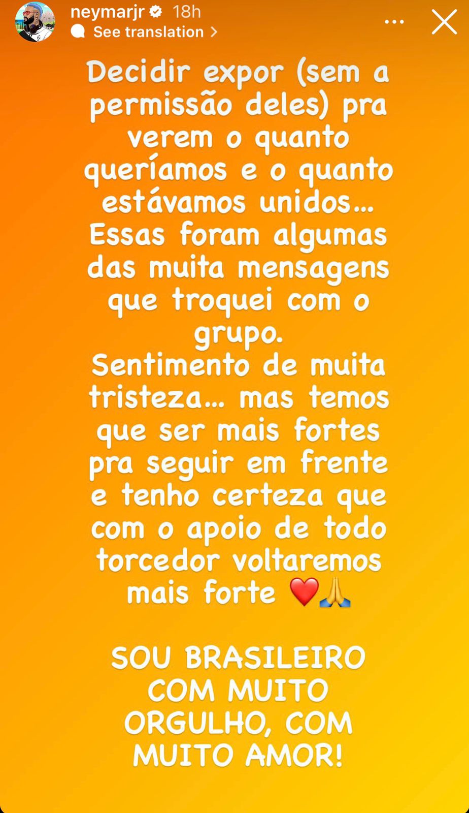 نشر اللاعب البرازيلي نيمار دا سيلفا سانتوس جونيور، على خاصية الستوري عبر "انستغرام"، محادثات خاصّة على تطبيق "واتساب" مع زملائه بالمنتخب تياغو سيلفا وماركينوس ورودريغو دون إذنهم، لإظهار مدى اتحادهم، وليحارب مزاعم انقسام الفريق بتلك الرسائل، وذلك وفق ما نشرت صحيفة "ديلي ميل".