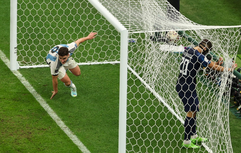 ولم ينتظر الأرجنتينيون طويلاً لإضافة الهدف الثاني عبر ألفاريز الذي انطلق بهجمة مرتدة سريعة ثم استفاد من فشل مدافعين كرواتيين في قطع الكرة بالشكل المناسب وسدد في الشباك (39)، ليسجل هدفه الثالث في هذه النهائيات