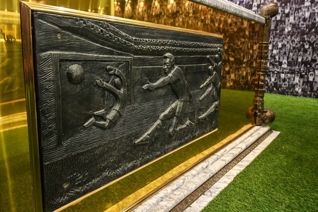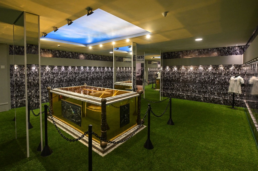 يُستقبل المشجعون بتمثالين ذهبيين للاعب الملقب بـ "الملك"، الذي وضع جثمانه داخل مربع ذهبي كبير معروض في منتصف مساحة 200 متر مربع في غرفة مغطاة بالسجاد من العشب الصناعي.