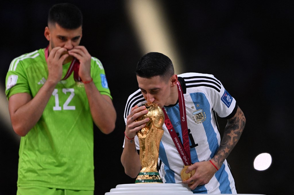 المنتخب الأرجنتيني على منصة التوويج في استاد "لوسيل" في الدوحة (أ ف ب).
