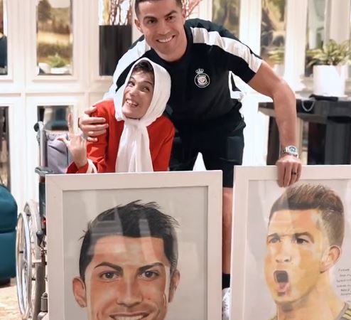 زارت الرسامة الإيرانية فاطمة، التي تعاني من ظروف صحية استثنائية، مقر بعثة فريق "النصر" في طهران، والتقت بنجم النادي كريستيانو رونالدو، وقدّمت له رسمتين.