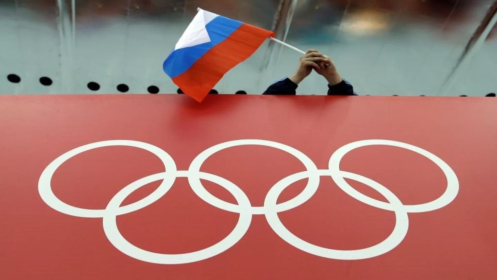 العلم الروسي مع شعار الأولمبية الدولية. (أ ف ب)