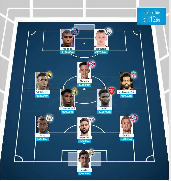 وبلغت القيمة الإجمالية لتشكيلة الفريق الأغلى في العالم نحو 1.12 مليار يورو، وفق خطة (3-2-3-2)، علماً أن القيمة تتغيّر حسب خطة اللعب.