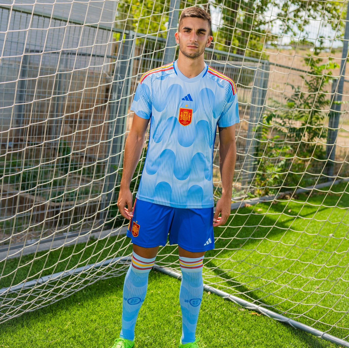 وجاء قميص المنتخب الإسباني الأساسي لكأس العالم 2022 باللون الأحمر التقليدي فيما الزي البديل لونه أزرق سماوي ويحمل ألوان العلم الإسباني على الأكتاف.