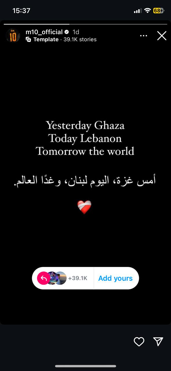 ونشر أوزيل عبر خاصية "الستوري" على حسابه في إنستغرام صورة سوداء مكتوب عليها بالغتين الإنكليزية والعربية: "أمس غزة، اليوم لبنان، وغداً العالم".