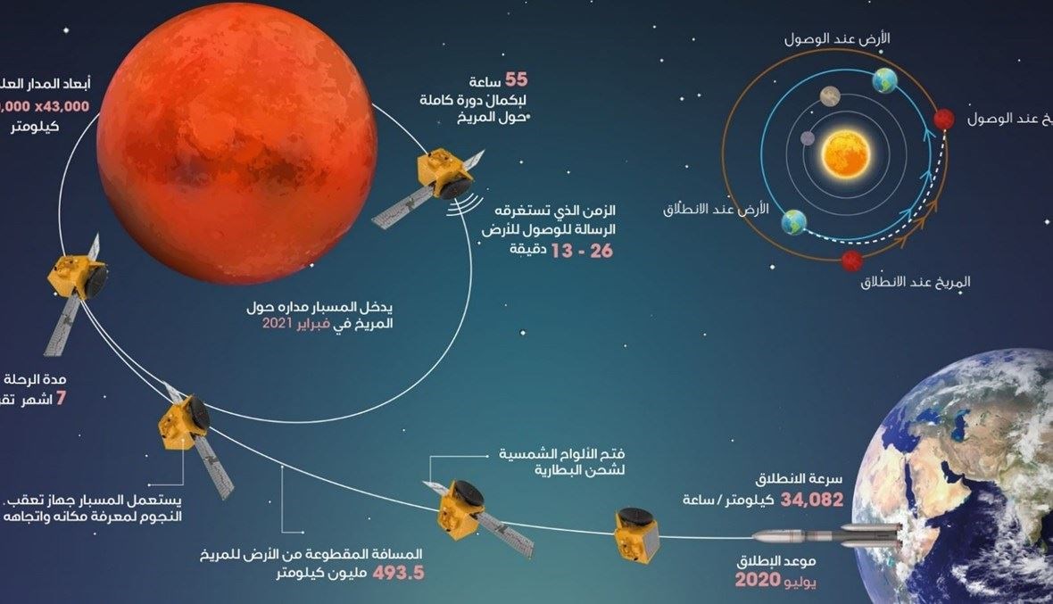 ومن المقرر أن يدخل "مسبار الأمل"، مدار الكوكب الأحمر في الساعة 7.42 مساءً بتوقيت الإمارات العربية المتحدة (6.42 مساءً بتوقيت بيروت) يوم غد الثلثاء 9 شباط 2021، بعدما انطلق منذ نحو 7 أشهر من قاعدة تاناغاشيما الفضائية في اليابان في 20 تموز 2020.
