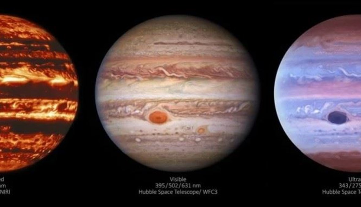 وتم التقاط الصور الثلاث بنفس الوقت في 11 كانون الثاني 2017، باستخدام "تلسكوب هابل" الفضائي المزود بكاميرا، و"تلسكوب جيميني نورث" الأرضي ومسبار "جونو" الفضائي التابع لوكالة الناسا. والنتيجة هي لقطة نادرة لكوكب المشتري في نقطة زمنية واحدة عبر مساحة واسعة من الطيف الكهرومغناطيسي، والاختلافات بين الصور رائعة.