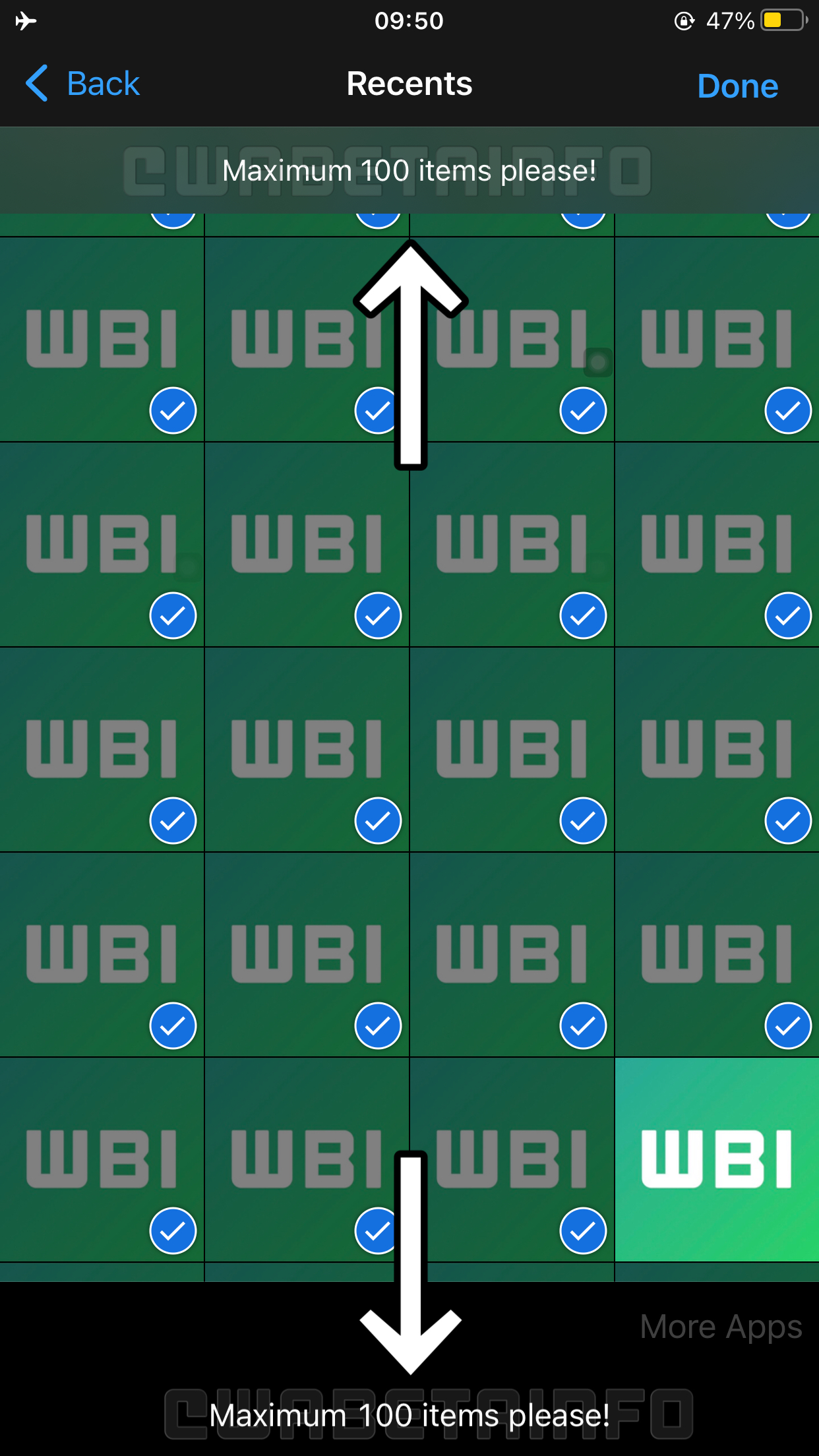 وقد شارك الموقع لقطة شاشة من "واتساب" أثناء تحميل صورٍ، حيث تظهر ملاحظة تقول إنّ الحدّ الأقصى هو 100 صورة.