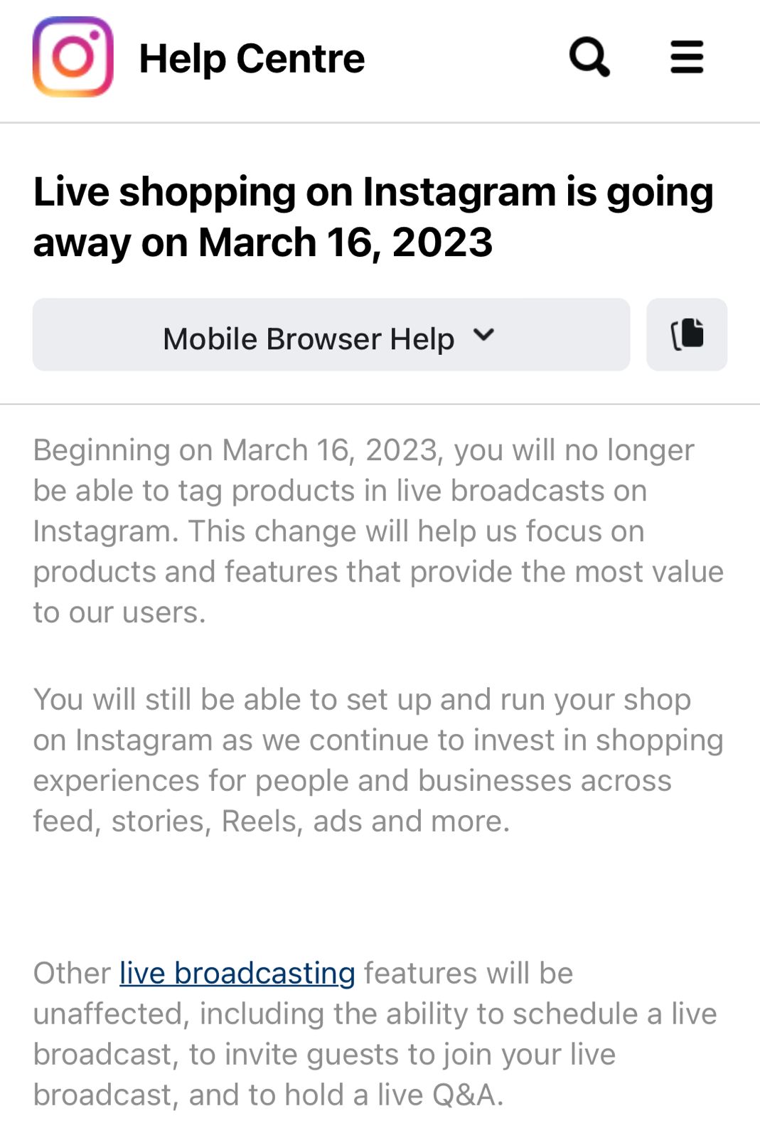 حذّر تطبيق "إنستغرام" المستخدمين من أنّ ميزة التسوّق المباشر ستُغلق في 16 آذار المقبل، وفي ذلك الوقت لن تستطيع المتاجر وضع علامة على المنتجات أثناء البثّ المباشر، وسيتعيّن على المستخدمين الانتظار لما بعد البثّ لشراء العناصر. وبرّر "إنستغرام" هذه الخطوة على أنّها وسيلة "لمساعدته على التركيز" على الميزات الأساسيّة في التطبيق.