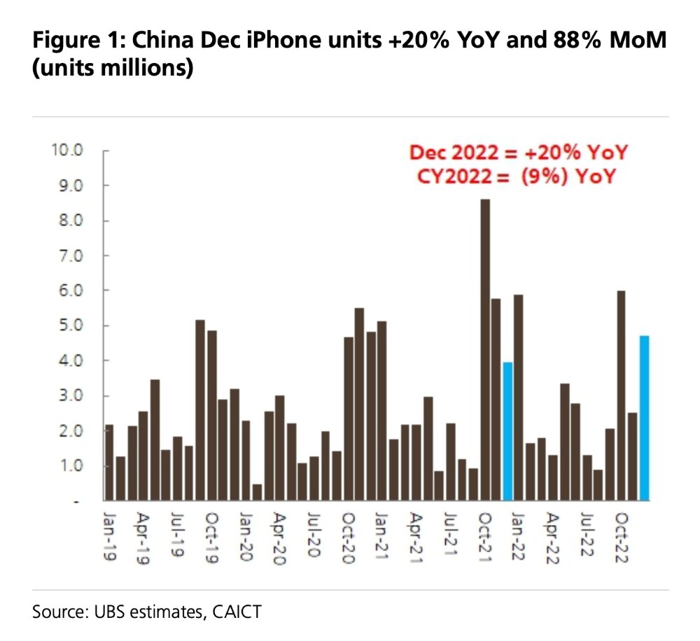 وتابع المحلّلون: "على الرغم من سرعة بيع "أيفون"، فمن المهم ملاحظة أن عمليات البيع خلال الربع الرابع انخفضت بنسبة 28 في المئة بسبب الاضطرابات بين تشرين الأول وتشرين الثاني. ومع ذلك، يجب أن تخفّف بيانات كانون الأول من مخاوف المستثمرين تجاه استمرار اضطرابات سلسلة التوريد المادية حتى عام 2023".