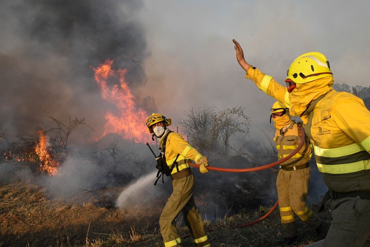 رجال إطفاء يحاولون إخماد حريق غابات بالقرب من قرية تابارا بالقرب من زامورا شمال إسبانيا (18 تموز 2022، أ ف ب).