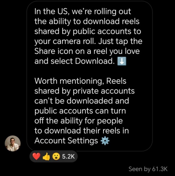 وتُظهر الصورة التي نشرها موسيري أن مقاطع الفيديو التي تمّ تنزيلها ستعرض علامة مائية عليها بشعار "إنستغرام" واسم الحساب، تماماً كما يفعل "تيك توك"، الذي تميّز بهذه الخاصيّة لفترة طويلة.