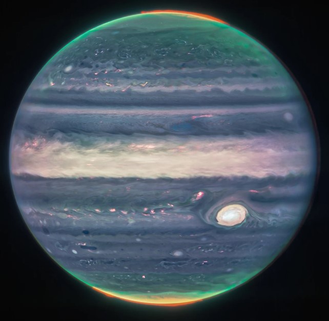 التقط تلسكوب "جيمس ويب" الفضائيّ صوراً بالأشعة ما تحت الحمراء تُظهر الشفق القطبي لكوكب المشتري، بالإضافة إلى رؤية حلقات الكوكب الخافتة للغاية واثنين من أقماره الأصغر، أمالثيا (النقطة المضيئة في أقصى اليسار)، وأدراستيا (النقطة الموجودة على الحافة اليسرى للحلقة المركزية).