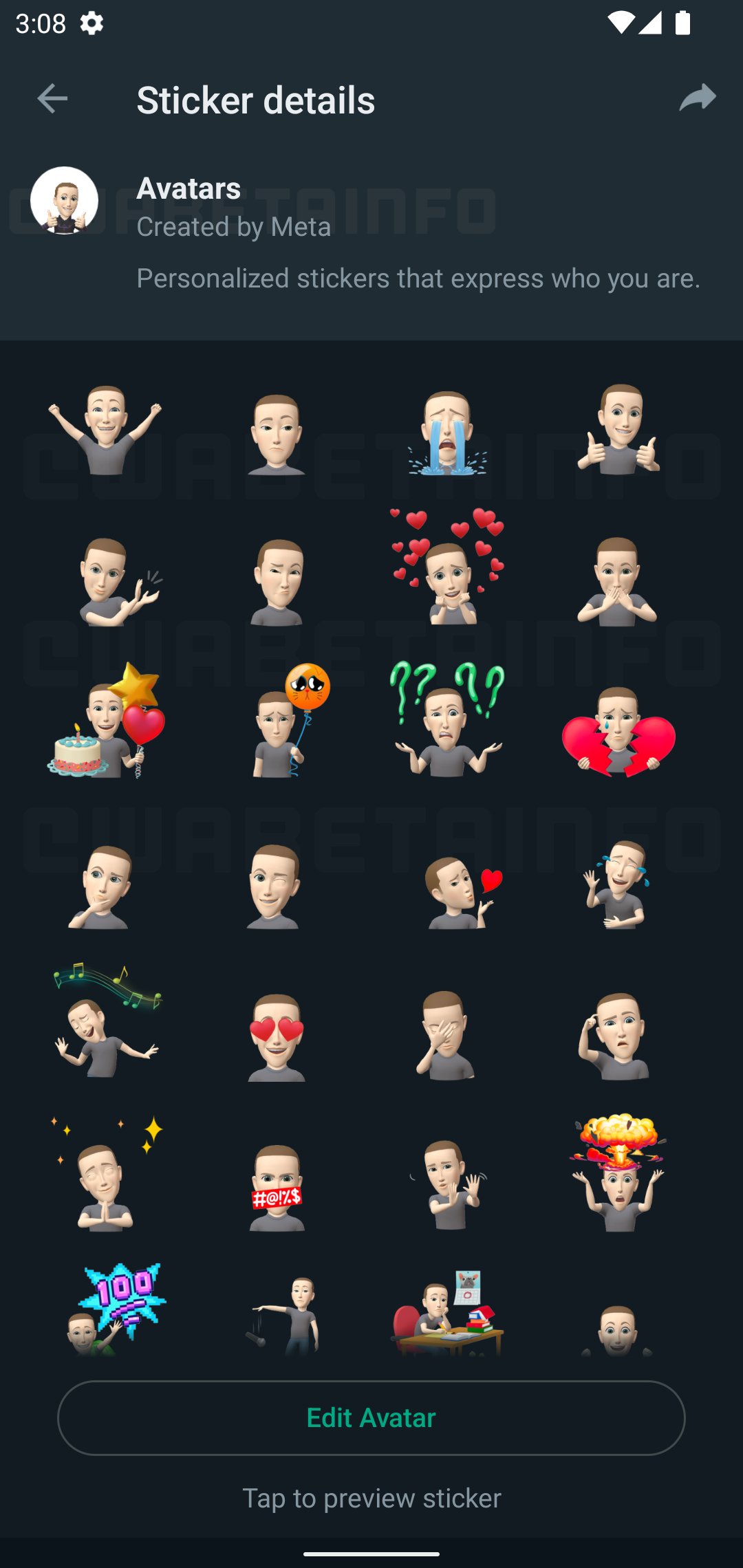 وسيرى أولئك الذين لديهم حق الوصول إلى الميزة فئة "Avatar" جديدة في قائمة الإعدادات الخاصة بهم، والتي يمكّنهم استخدامها بتصميم النسخة الرقمية الشبيهة لهم. ومثل تطبيقات "ميتا" الأخرى، سيقوم "واتسأب" بعد ذلك بإنشاء حزمة ملصقات مع الصورة الرمزية في أوضاع مختلفة، والتي يمكن للمستخدمين استخدامها للتعبير عن أنفسهم عند مراسلة العائلة والأصدقاء.