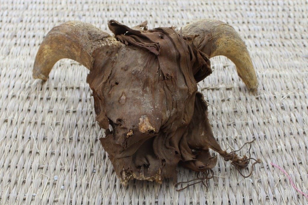 رأس كبش محنط تم اكتشافه في الحفريات الأخيرة في معبد رمسيس الثاني في أبيدوس (25 آذار 2023، أ ف ب).