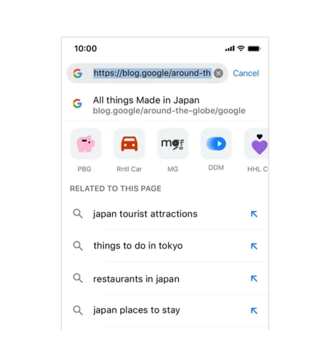 على سبيل المثال: إذا كنت تقرأ مقالًا عن اليابان في الوقت الذي تخطط فيه لرحلة مقبلة. عند النقر على شريط العناوين، سترى قسماً جديداً بعنوان "ذو صلة بهذه الصفحة"، مع اقتراحات لعمليات البحث الأخرى، مثل المطاعم المحلية أو مناطق الجذب السياحي في اليابان.