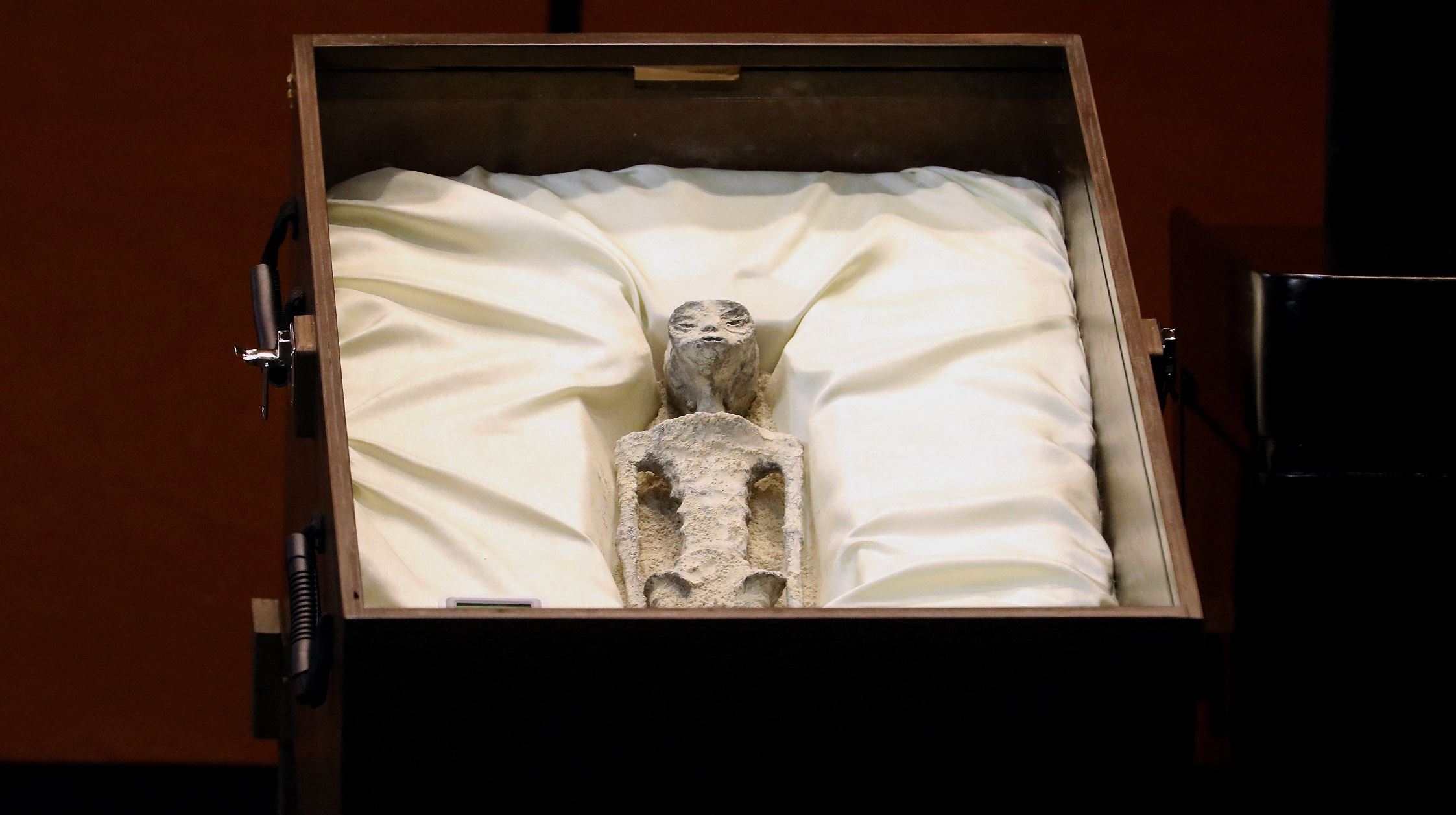 عرض خايمي موسان، وهو صحافي متخصّص في علم الأجسام الطائرة المجهولة ودراسة الأجسام الطائرة المجهولة والظواهر الفضائية، تابوتَيْن صغيرَيْن يحتويان على متحجّرات مفترضة لكائنَيْن فضائيَّيْن، أمام النواب الثلثاء.