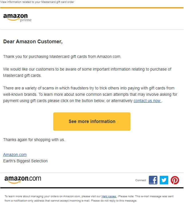 والرسالة الإلكترونية التي وصلت للمستخدمين جعلتهم يشكون في أن الرسالة نفسها احتيالية. وذلك على الرغم من أنها أرسلت من عنوان بريد إلكتروني تابع لشركة أمازون، وهو "[email protected]".