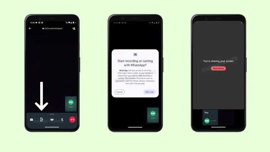يسعى تطبيق "واتساب" على طرح ميزة مشاركة الشاشة، والتي ستعرض وستسجّل محتويات شاشة المستخدم مع أيّ شخص موجود على الطرف الآخر من مكالمة الفيديو، وفقاً لتقرير من موقع "WABetaInfo".