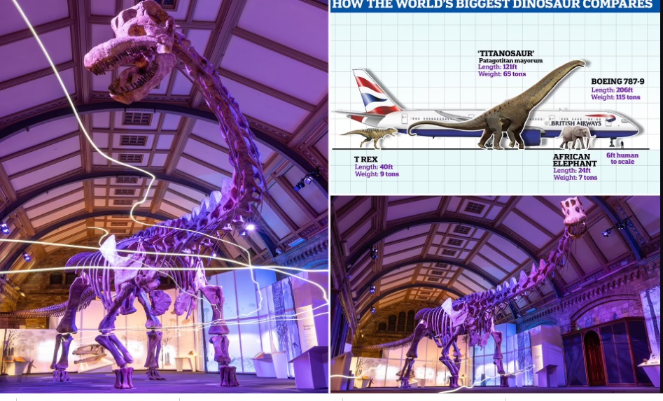 ويُعرَض الهيكل العظمي للحيوان الذي ينتمي إلى عائلة التيتانوصورات والمُسمى "تيتان باتاغونيا" في صالة عرض متحف التاريخ الطبيعي في لندن. وأكد الباحثون أنّ هذا الديناصور ولو كان بوضعية مستقيمة لكان حجمه مماثلاً لمبنى مؤلّف من خمس طبقات.