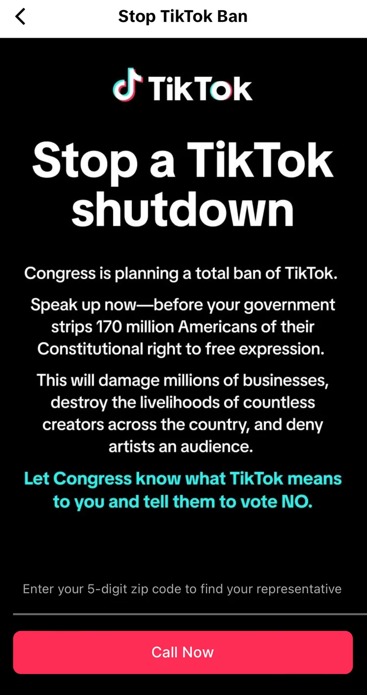 أرسل التطبيق الصيني للمستخدمين في الولايات المتحدة إشعارًا، يحذر فيه من أن "الكونغرس يخطط لفرض حظر كامل على تيك توك" من شأنه أن "يجرد 170 مليون أميركي من حقهم الدستوري في حرية التعبير".