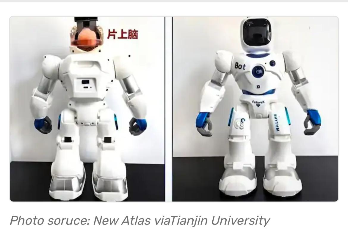 طوّر باحثون في جامعة "تيانجين" Tianjin في الصين "روبوت" بشريًا يعمل باستخدام خلايا الدماغ البشرية، فيتعلّم ويتكيّف مع بيئته بوساطة الإشارات الكهربائية والمدخلات الحسيّة، متجاوزًا الحاجة إلى تعليمات مبرمجة مسبقًا.
