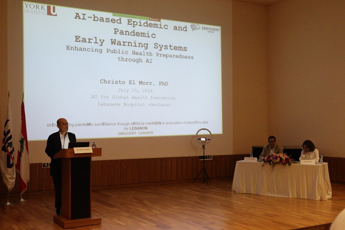 بعد ذلك، قدم الدكتور خريستو المرّ، أستاذ المعلوماتية الصحية ومدير مركز البحوث النسائية في جامعة يورك، مراجعة شاملة حول أنظمة الإنذار المبكر للأوبئة والجائحات المعتمدة على الذكاء الاصطناعي. شدد تحليل الدكتور المرّ على الإمكانيات الهائلة للذكاء الاصطناعي في التنبؤ وإدارة الأزمات الصحية وعلى ضرورة التنبّه لمعالجة سلبيّات الذكاء الصناعي كالتمييز بين الناس.