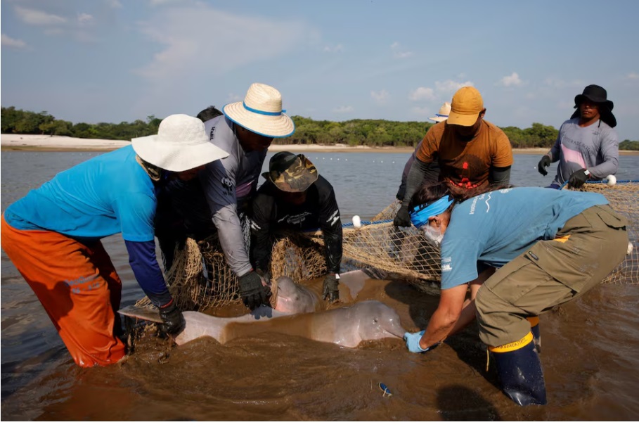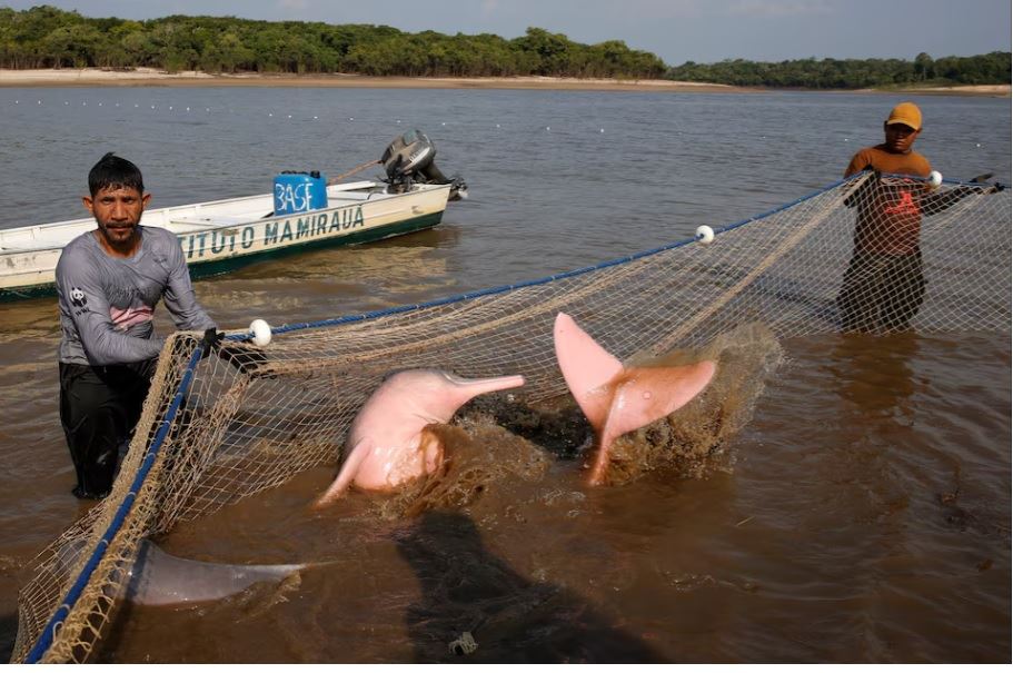 أمسك فريق من علماء الأحياء والأطباء البيطريين والصيادين بدلافين مياه عذبة نادرة في حوض نهر الأمازون هذا الأسبوع لدرس صحتها، أملا في تجنب تكرار ما حدث العام الماضي من وفاة مئات الحيوانات الثديية بسبب جفاف شديد.