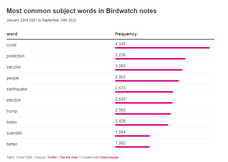وتشير البيانات إلى أنّ مستخدمي "Birdwatch" قد أمضوا الكثير من الوقت في مراجعة التغريدات المتعلقة بكورونا والتطعيم واستجابة الحكومة للوباء، وتوضّح قائمة بالكلمات الأكثر تكراراً أنّ "كورونا" هو مصطلح الموضوع الأكثر شيوعاً، ويحتل مصطلح "لقاح" المرتبة الثالثة.