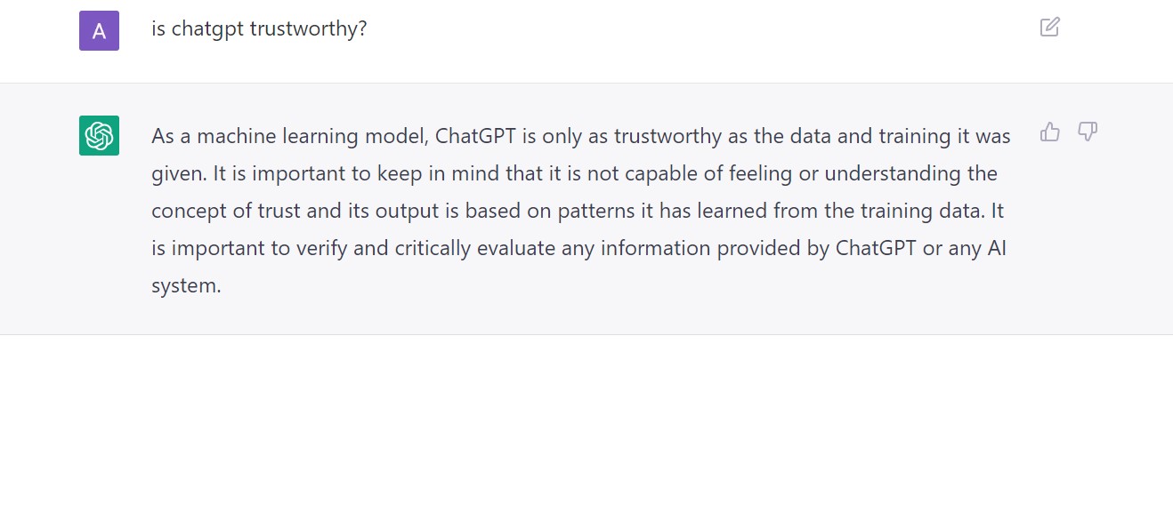 كنموذج للتعلّم الآلي، فإن "ChatGPT" غير قادر على الشعور بالثقة أو عدم الثقة. إنّه أداة يمكن استخدامها لإنشاء النصوص بناءً على المدخلات التي تتلقاها. لكن جودة النصوص ودقتها تعتمد على البيانات التي تمّ التدرّب عليها، وعلى المهمّة المحدّدة التي يتمّ استخدامها من أجلها.
