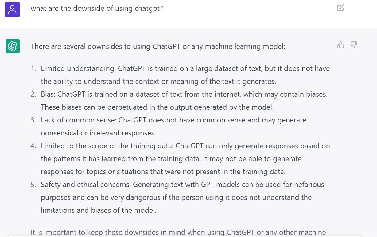 من المهم معرفة أن أجوبة ومخرجات "ChatGPT" ونماذج اللغة الأخرى يمكن أن تتأثر بالبيانات التي تمّ التدرّب عليها، ويمكن أن تعكس أيّ تحيّزات موجودة فيها. يجب تقييم أجوبة النموذج والتحقّق منها قبل استخدامها في أيّ سياقٍ جادّ، خاصّةً عند اتخاذ أيّ قرار، أو اتّخاذ أيّ إجراء، بناءً على الأجوبة هذه.