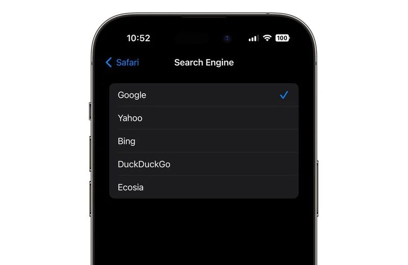 يعدّ "غوغل" محرك البحث الافتراضيّ على أجهزة "أبل" في معظم البلدان، ولكنّ بإمكان المستخدمين التبديل إلى "Yahoo وBing وDuckDuckGo وEcosia". ويتطلّب التغيير فتح إعدادات "سفاري" واختيار البديل.